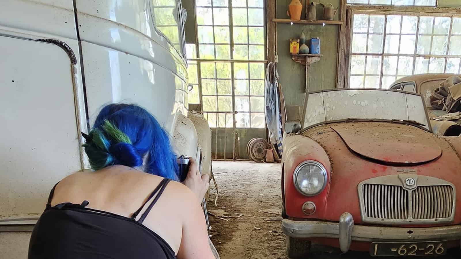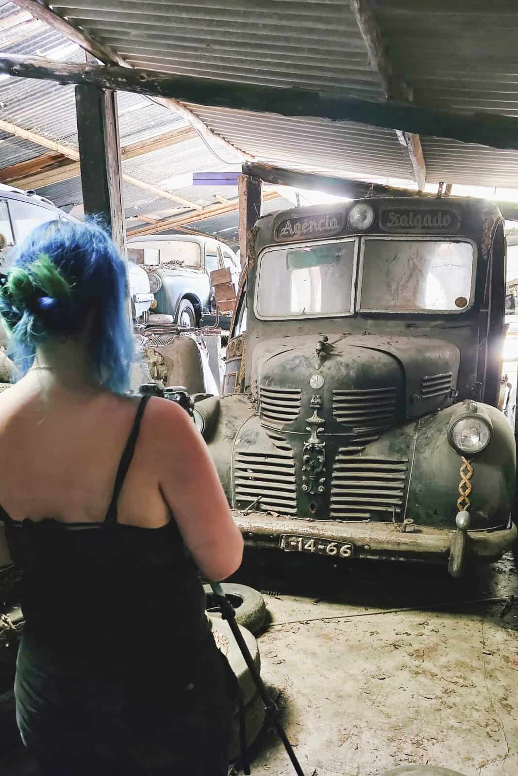 On the final day of the trip, I explored a mammoth collection of cars tucked away inside some large warehouse-sized garages. Inside is a fascinating treasure trove and an eclectic collection of vehicles. From Portuguese taxis and ornate funeral cars to an Art Deco Buick and a sporty red MG convertible. Curiously, an old armoured personnel carrier sits against one wall. Locked up tight, but I managed to shoot through a propped-open viewport slit.