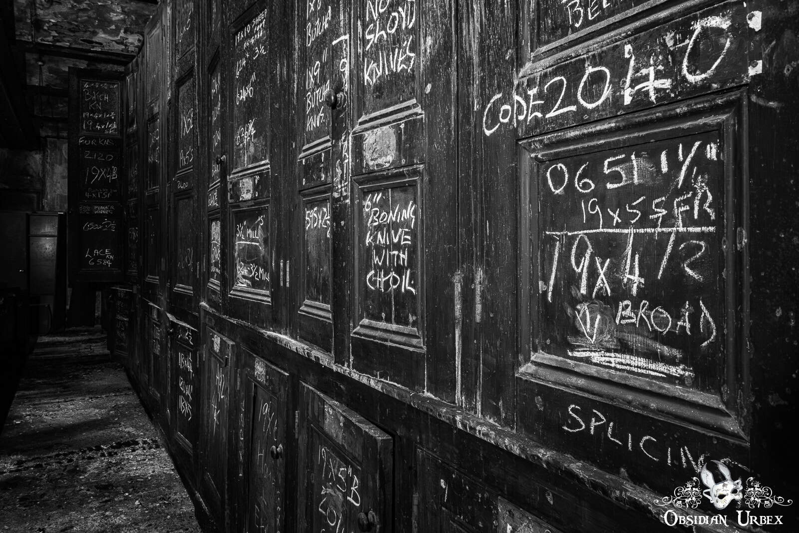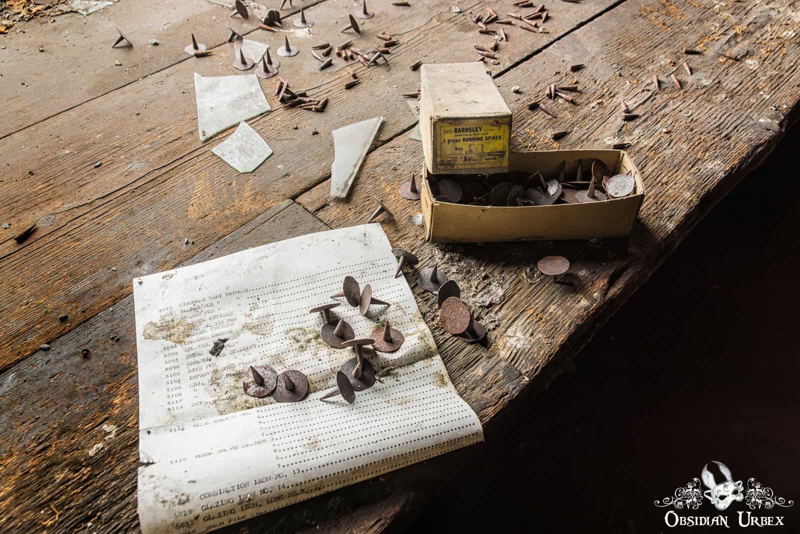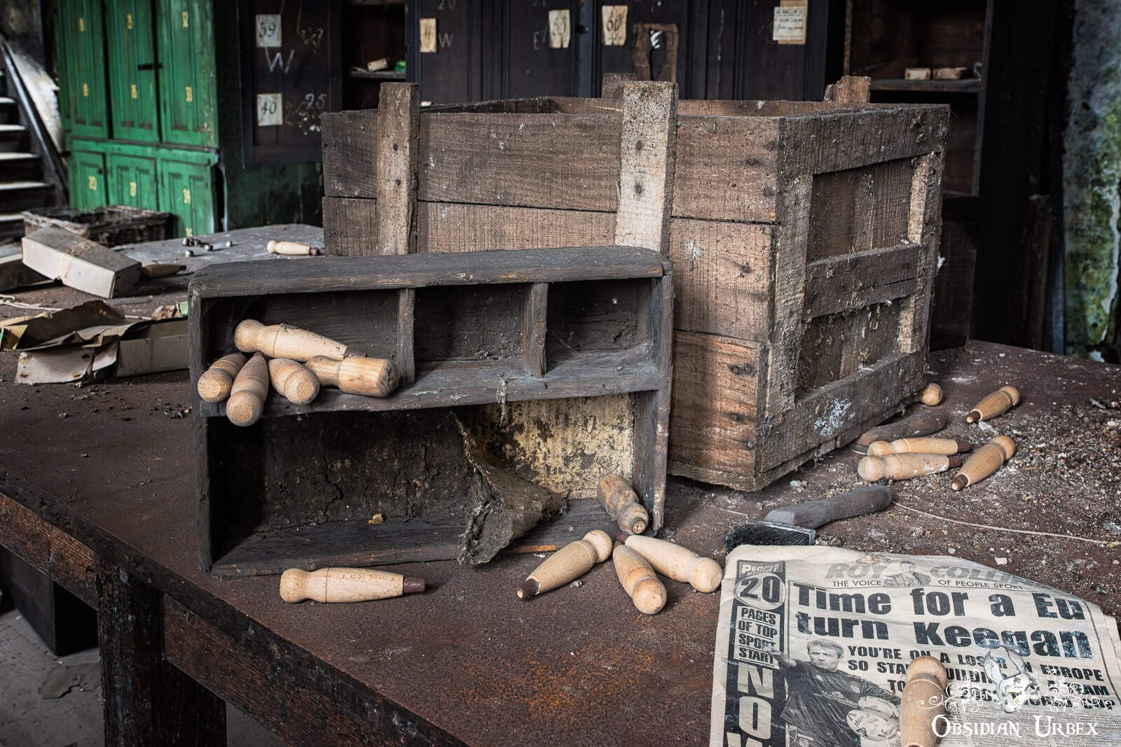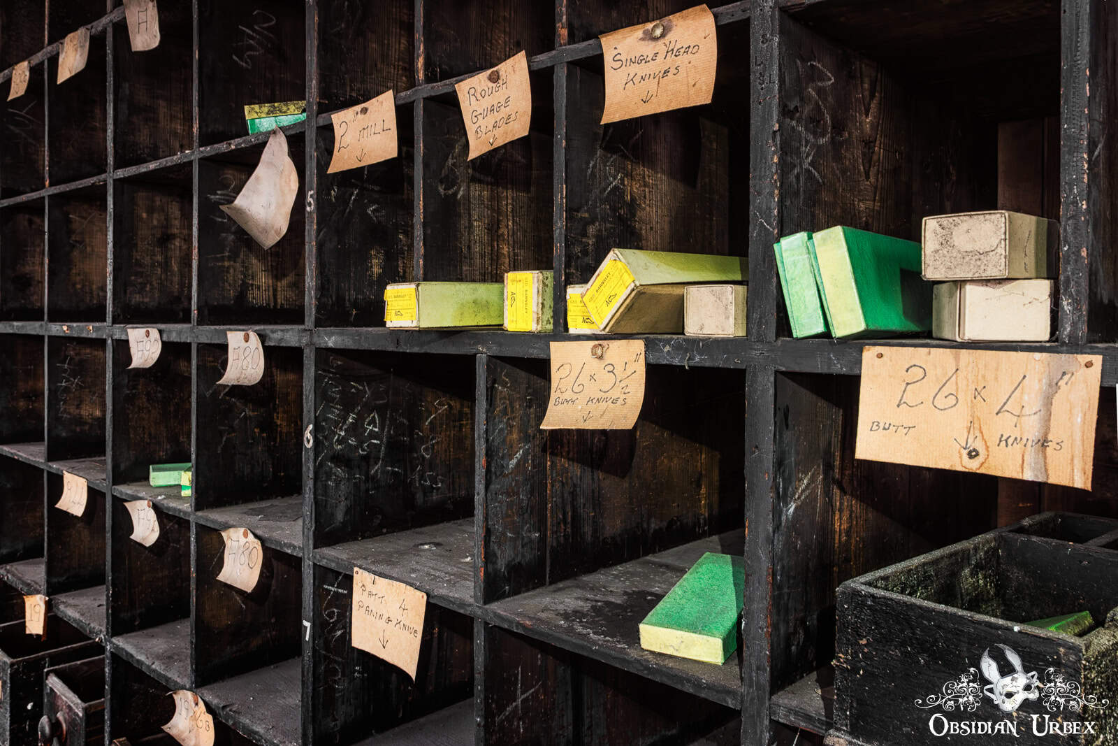 Heavy forging hammers and grinding wheels remain in the ground-floor workshops. The upper floors were used for lighter assembly and storage. These area feature wooden racks designed specifically to hold thousands of individual tool components. These racks still feature chalk markings and pinned paper notes, part of the stock control systems of the day.
