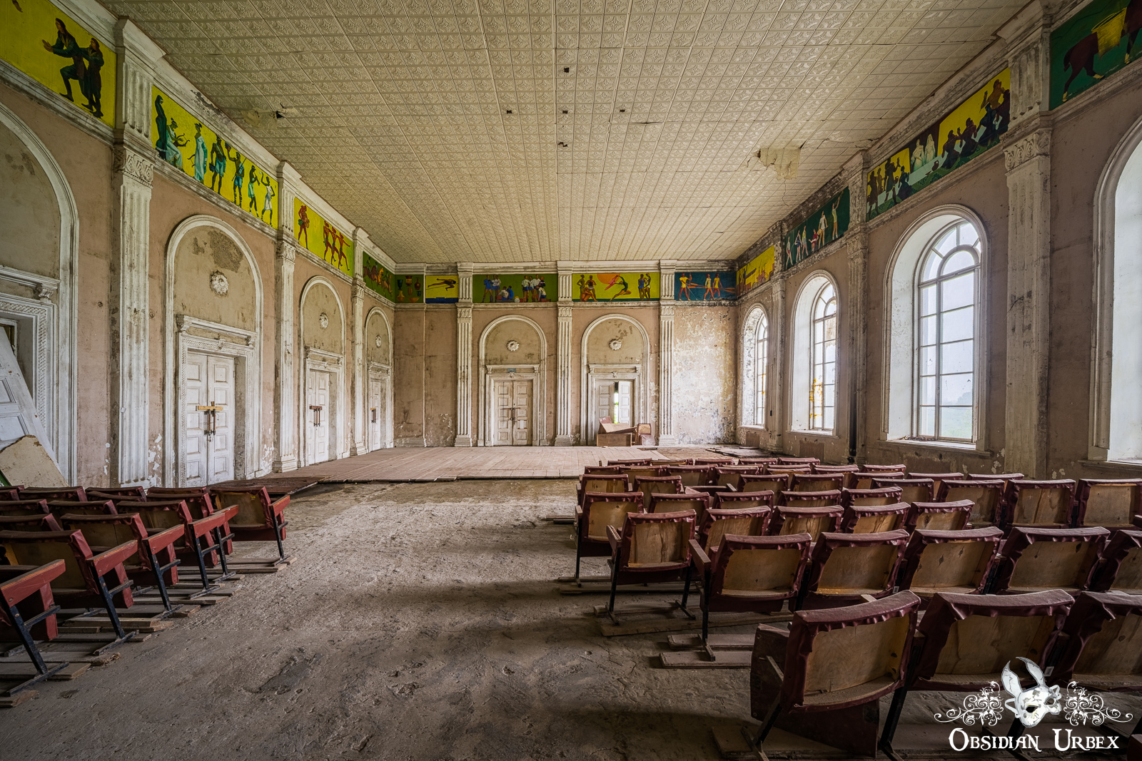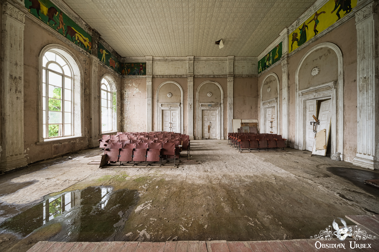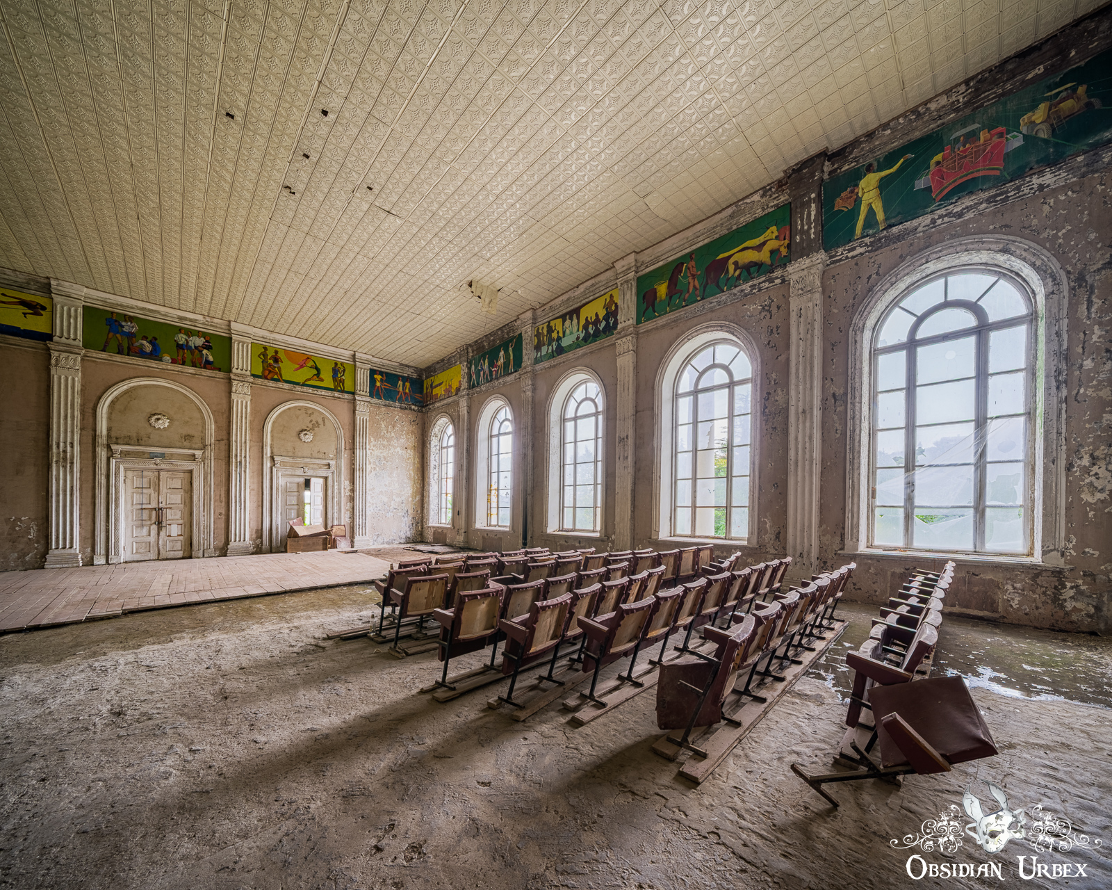 Next to the main hall is what looks like a former sports room. The upper walls still bear painted scenes of athletes in motion, undertaking various sporting activities. A handful of old theatre seats have somehow found their way in here; perhaps this side room was in use more recently in some fashion.