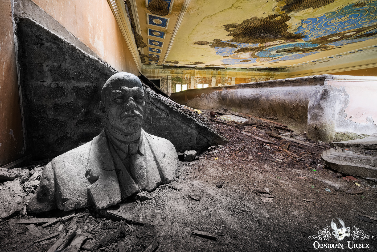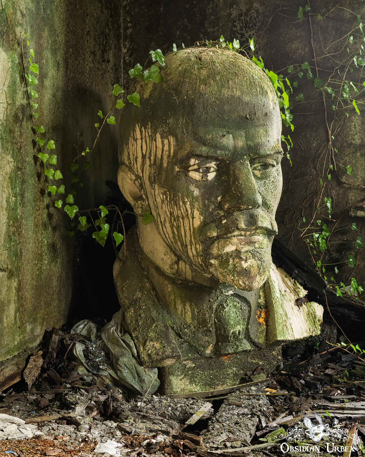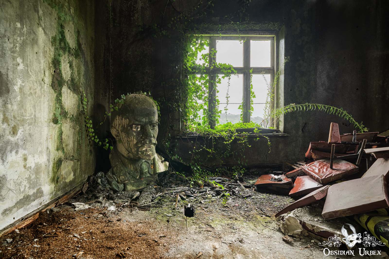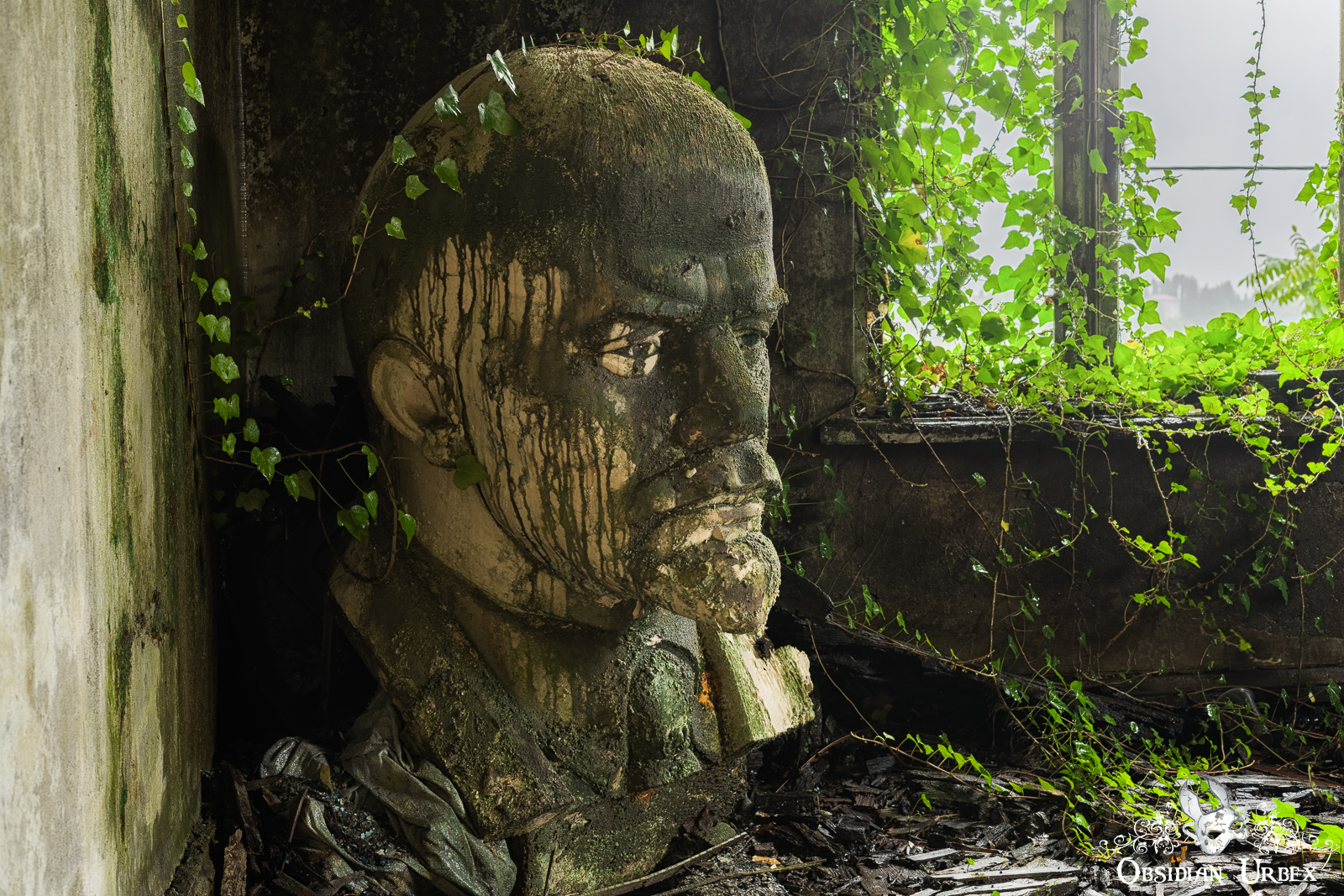 In a small collapsing room at the rear of the building, there is another Lenin bust. This larger version stands in the corner; ivy has found its way through a window nearby and clings to his head!