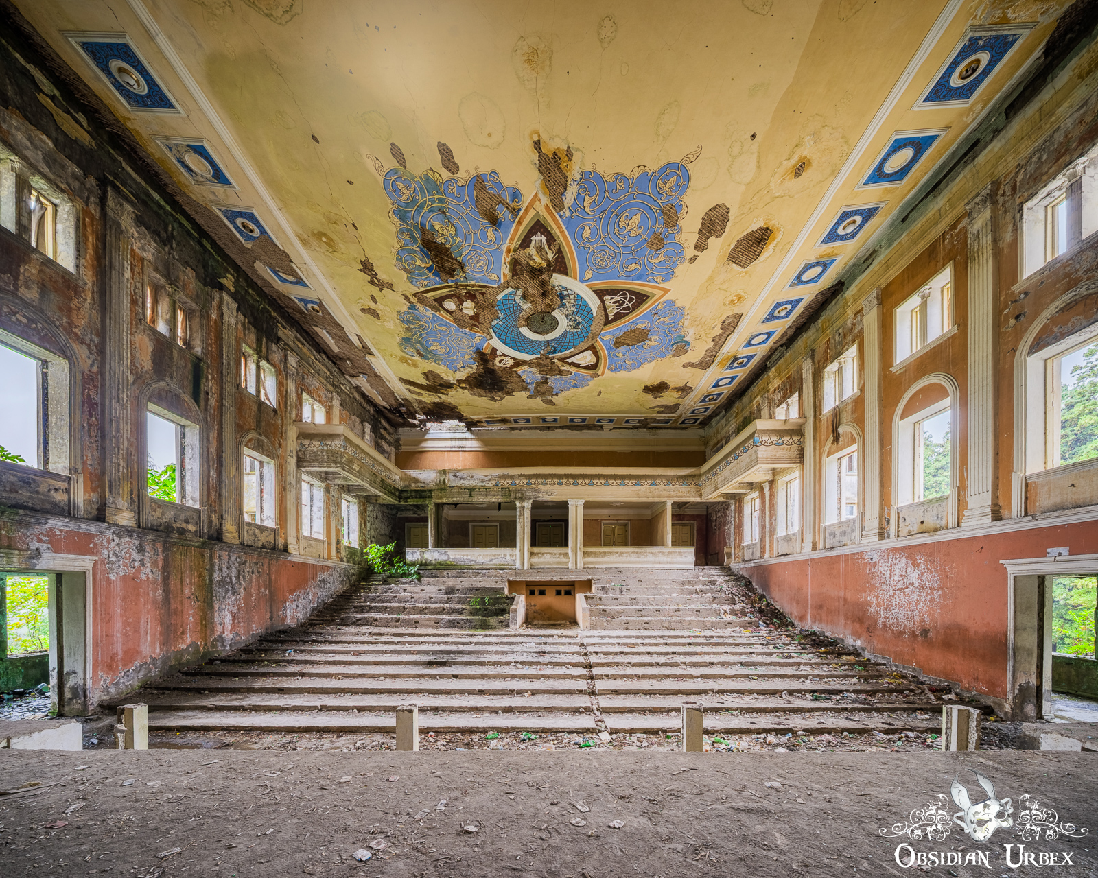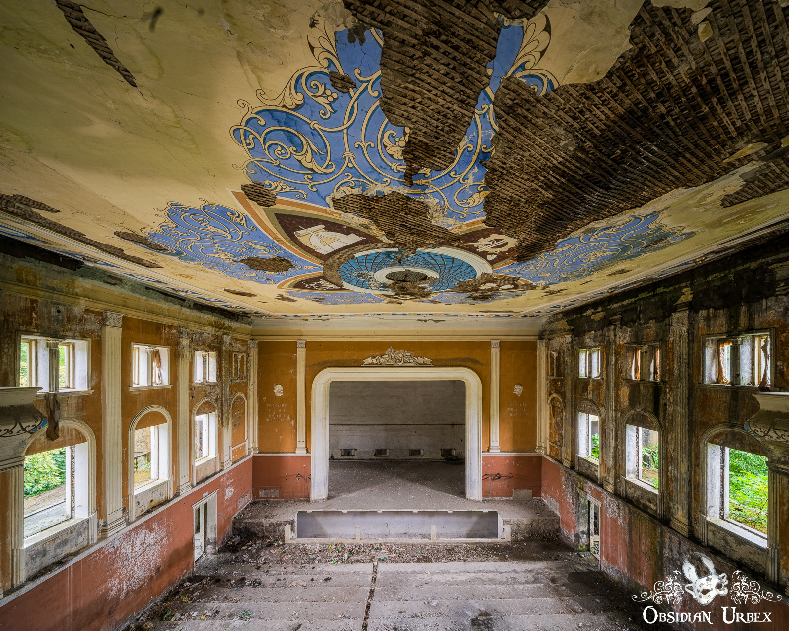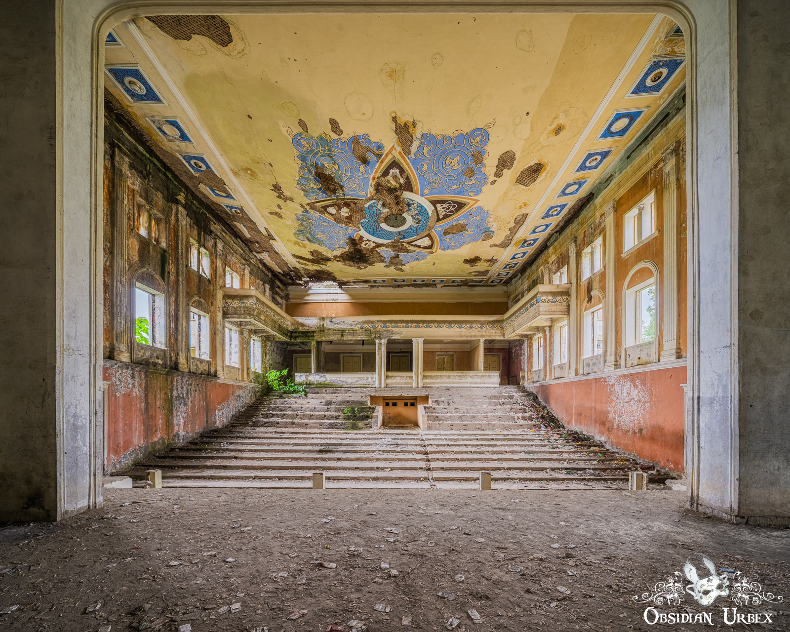 The main hall is an impressive space, with a large stage area. Essentially this area is an empty shell; the rows of folding seating and any other fixtures were stripped decades ago. The slope of the auditorium is still visible, with the rows of seats tiered and rising towards the back wall. Above, a faded ceiling motif features a stylised star or floral pattern. The design incorporates blue, brown, and orange as intricate patterns made up of five segments with a circular centre.