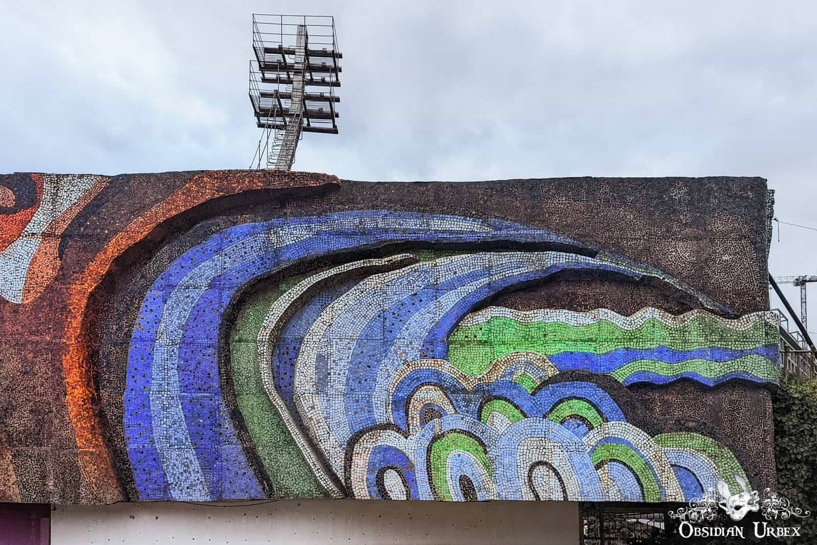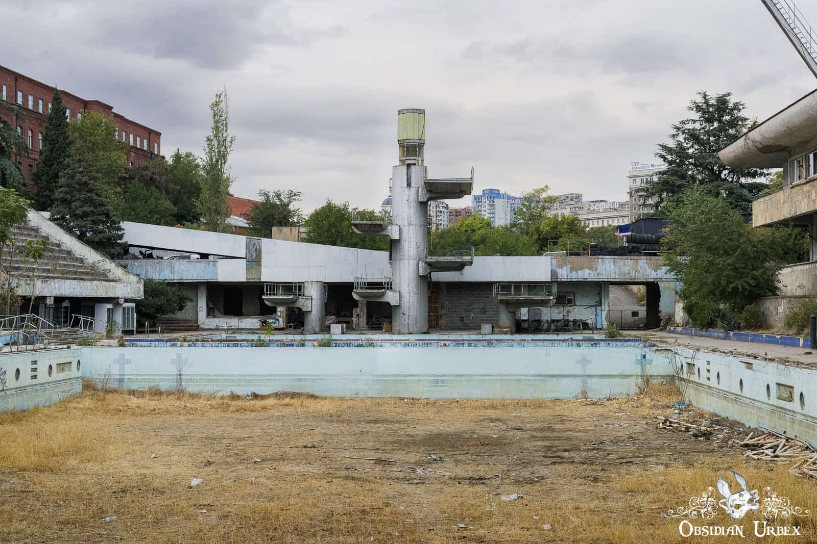 The complex consisted of three outdoor pools: a 50 × 25m Olympic competition pool, a 25 × 20m diving pool, and a 25 × 10 m training pool. The diving pool has boards at 3m, 5m, 7.5 meters, and 10m (the 10m for Olympic-standard diving). Seating capacity for spectators could accommodate 5,500 people. The diving tower above the pool is cast in exposed concrete, a hallmark of Soviet Brutalist expression. At the front, the façade featured a large mosaic by artist Koka Ignatov, crafted in the smalti-glass technique. This mosaic panel remains one of Georgia’s longest decorative artworks.