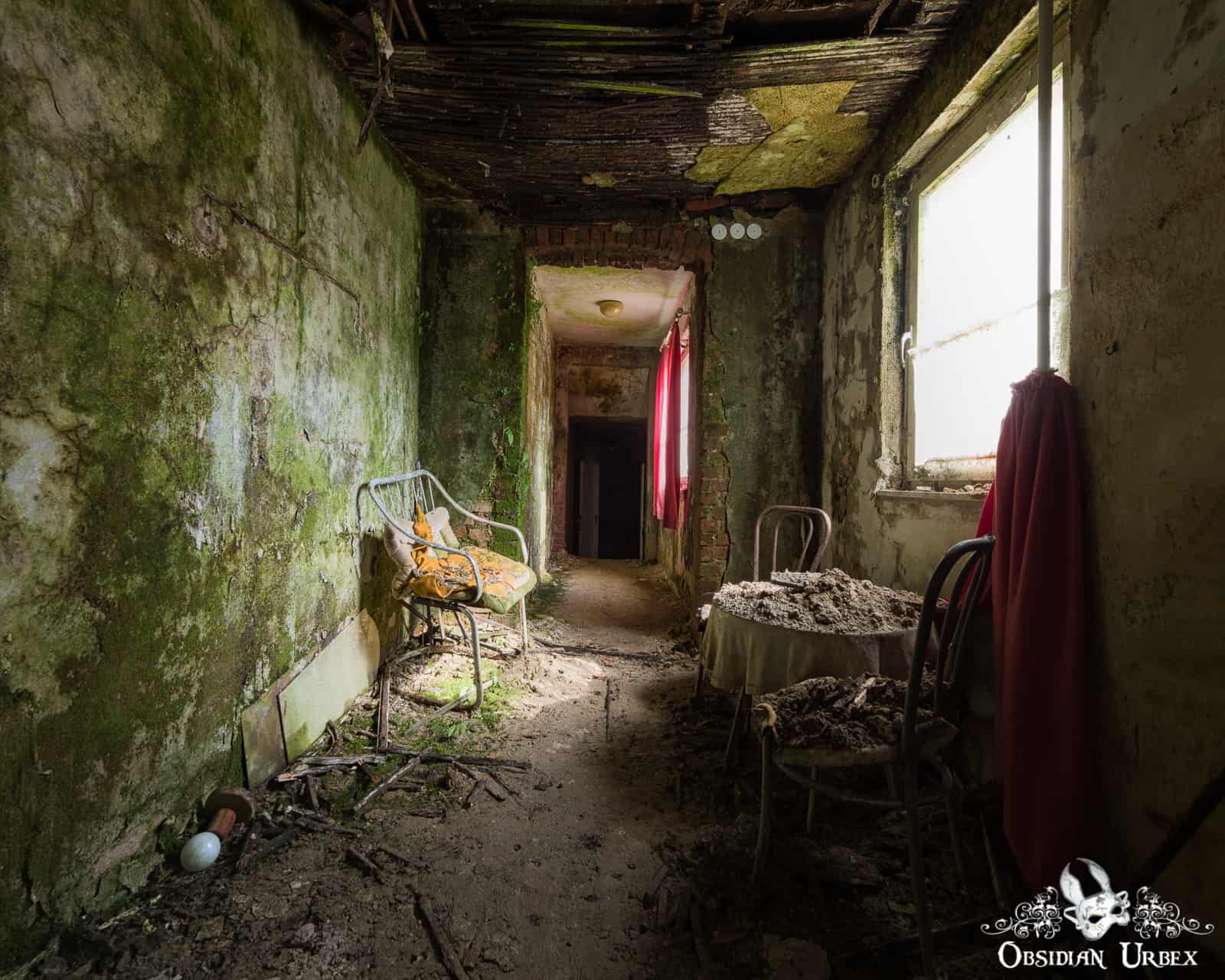 However, the second building is where the code name begins to make more sense. The main area of interest for a photographer of decay, is the restaurant. The dated decor is offset by wonderful vivid green moss growing on the carpet. Four mustard yellow chairs stand at a single round table, with an almost pristine white tablecloth. Additionally one of the legs of the chair has rotted away and it stands at a jaunty angle. On top of the table is a vase of faux flowers. The scene is highly staged after years of photographer intervention, of course.
