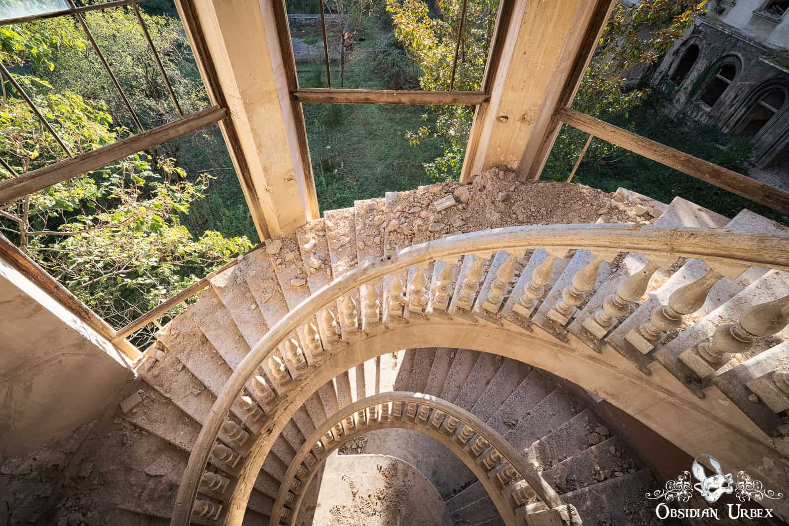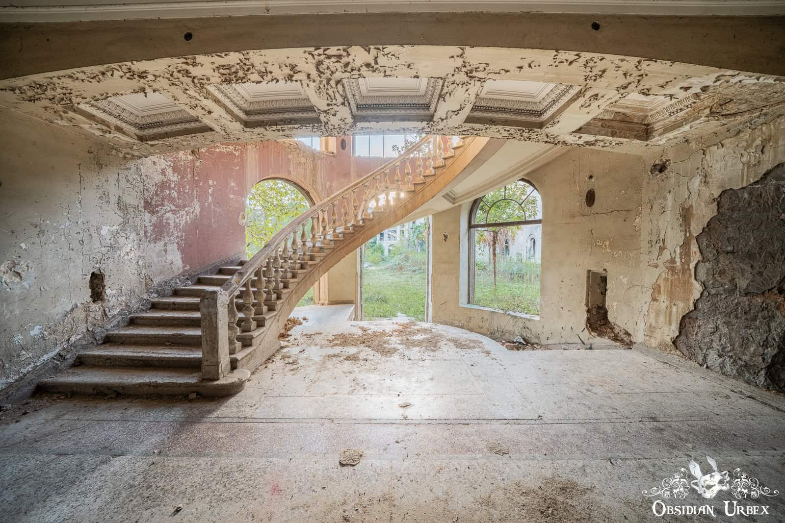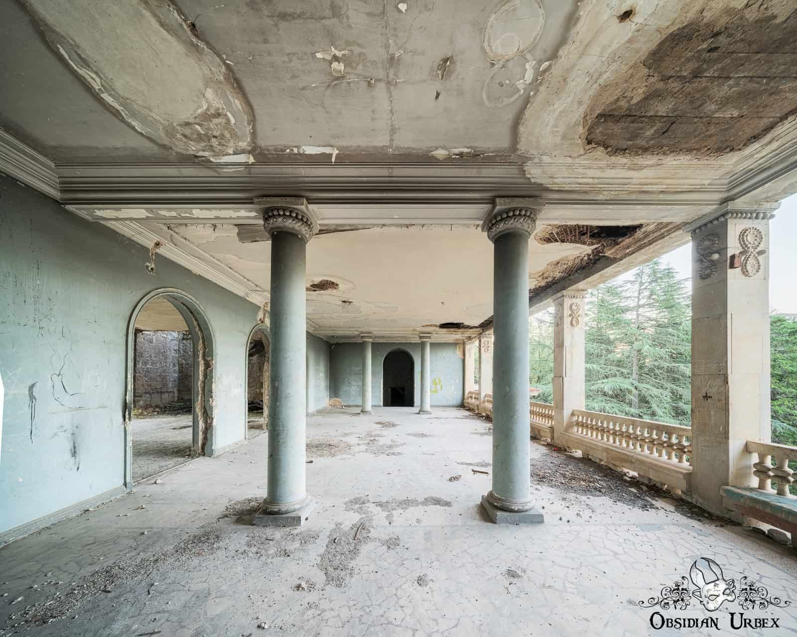 Sanatorium Imereti consists of a central entrance block with extended wings branching off to the east and west. These wings once housed guest rooms. The main entrance block staircase is one of the iconic features of this location. The staircase links the three floors, beautifully lit by three tall arched windows that offer views of the once manicured gardens outside. The symmetrical split-flight design is repeated twice as it scales the full height of the building. The upper galleries are supported by slender classical columns.