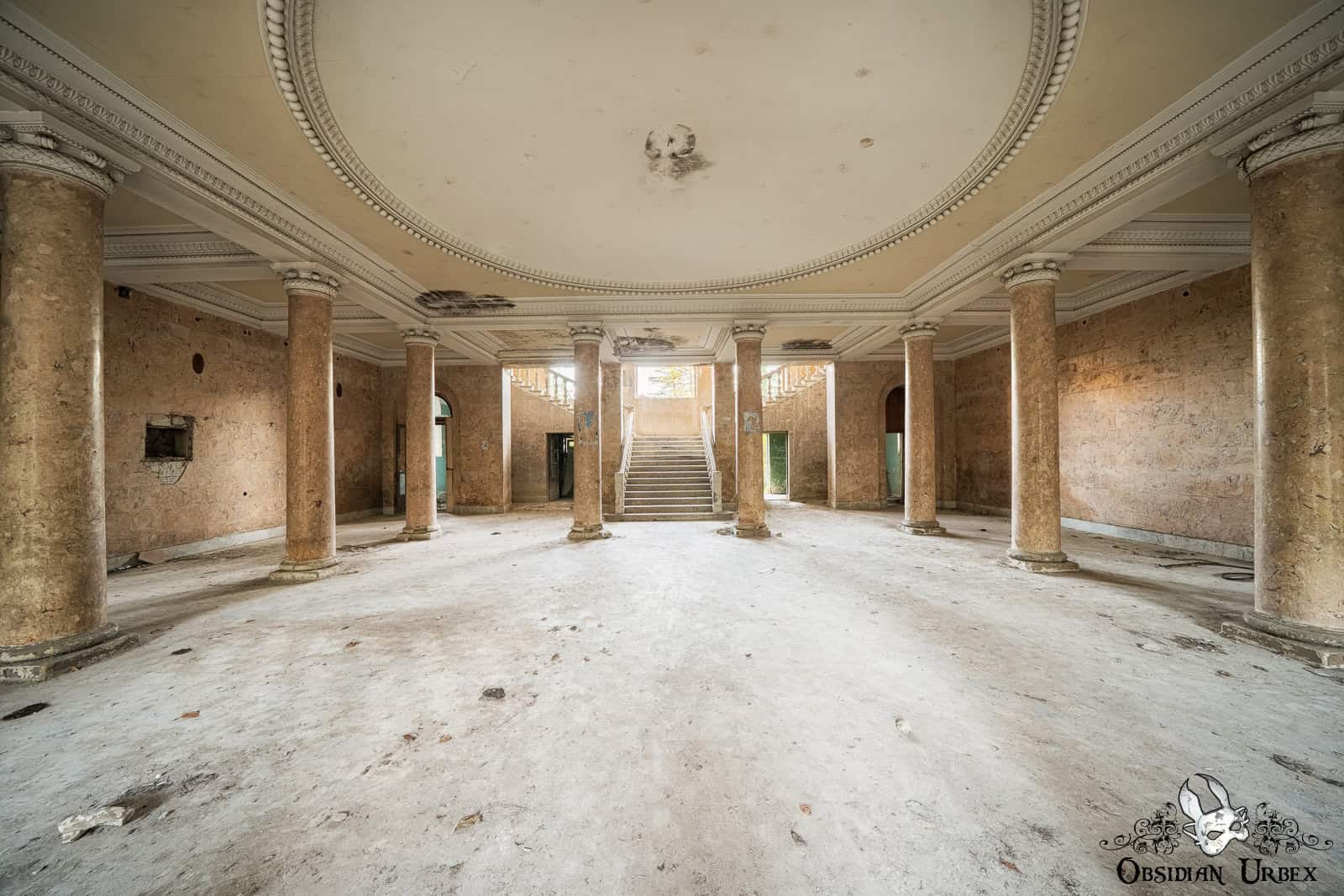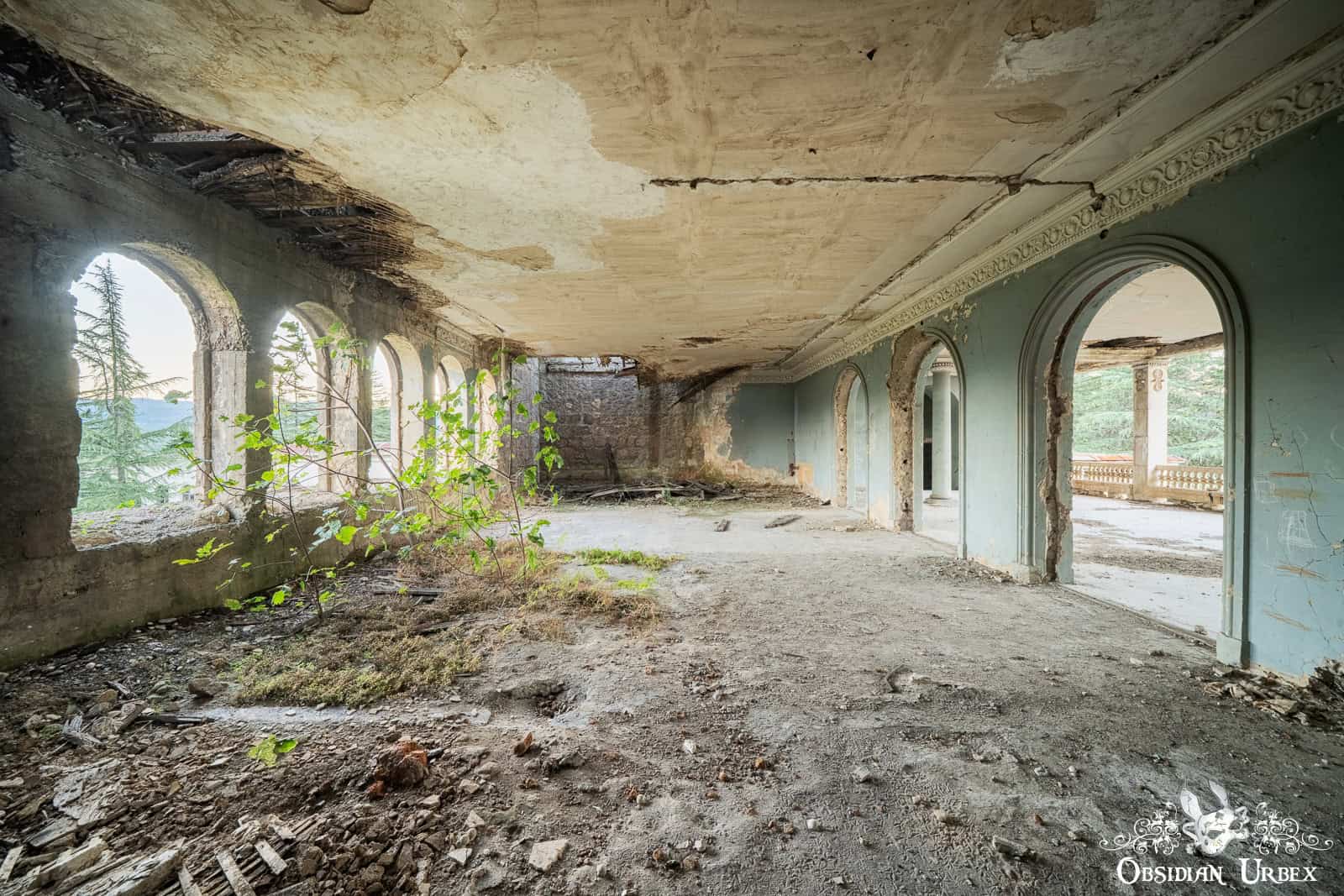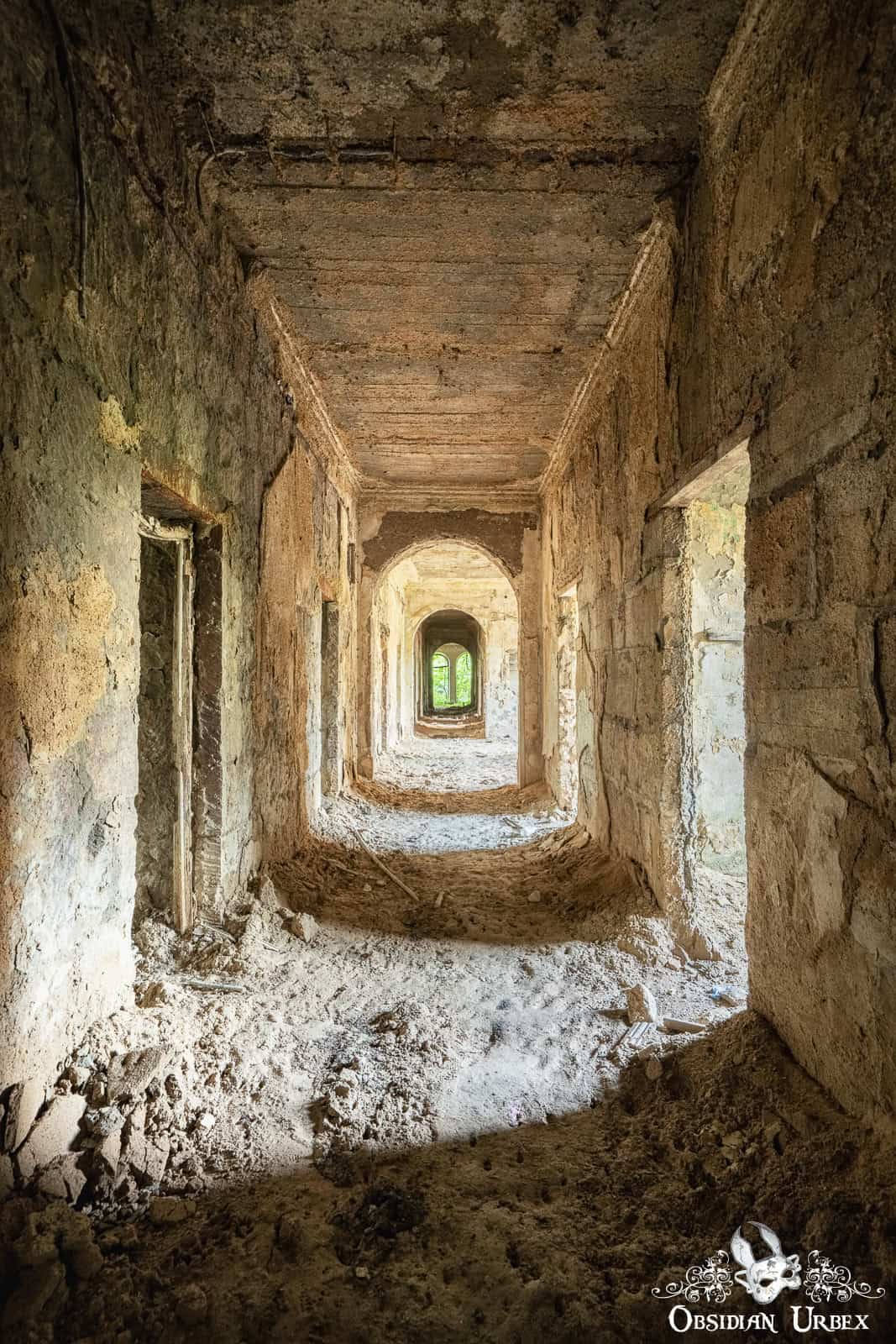 The sanatorium was in poor condition during my 2022 visit. Upper floors have started to collapse in some of the wings, and everywhere concrete falls from walls and ceilings in enormous chunks. Vegetation tentatively reaches through windows and doorways but seems reluctant to venture too far into the building. The west wing is primarily the area most affected by widespread collapse. The eastern wing was in much better condition when I visited and was home to several displaced families.