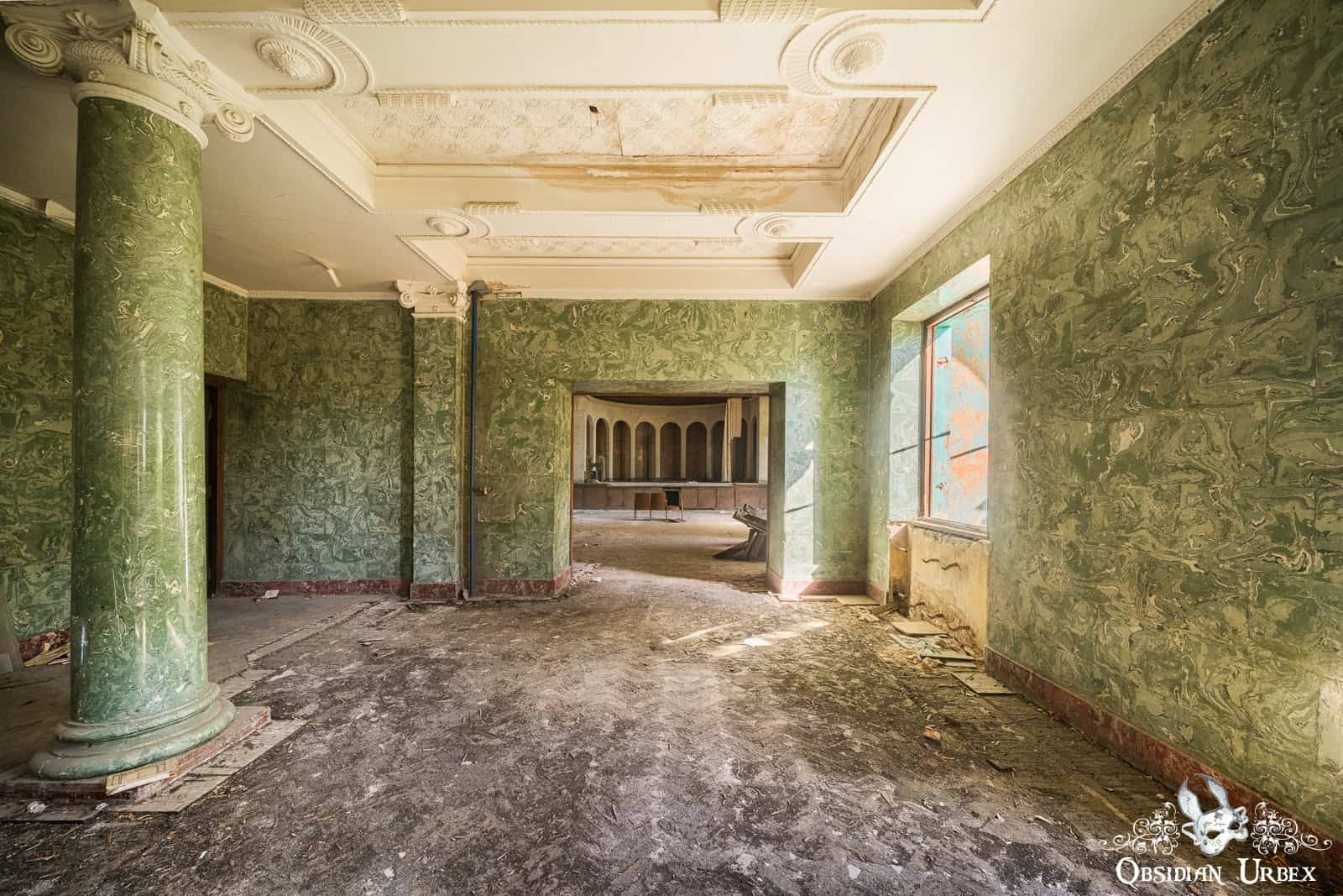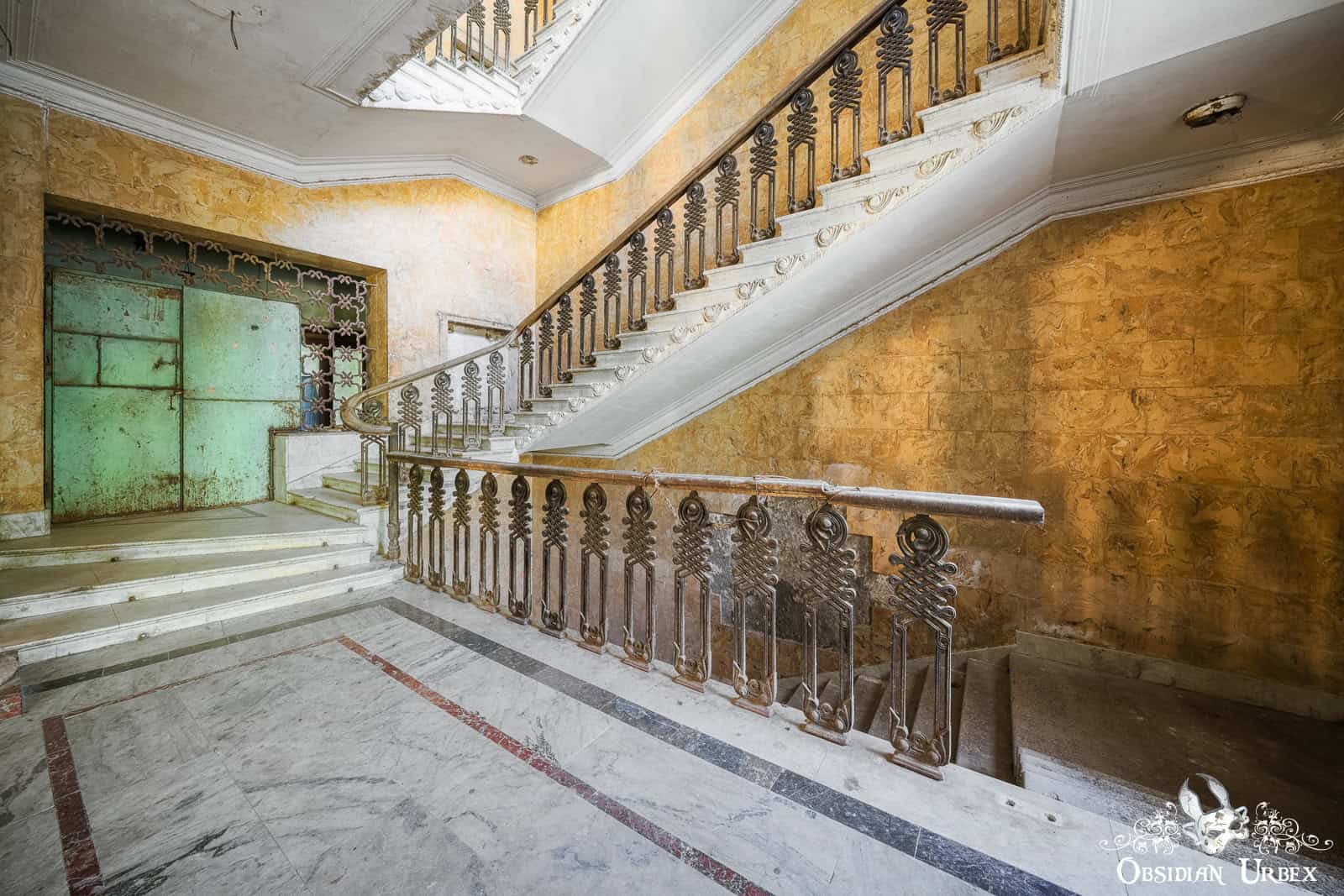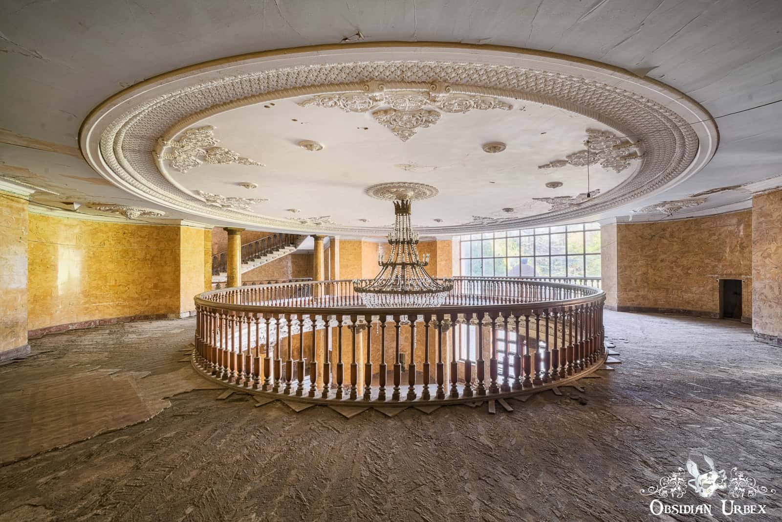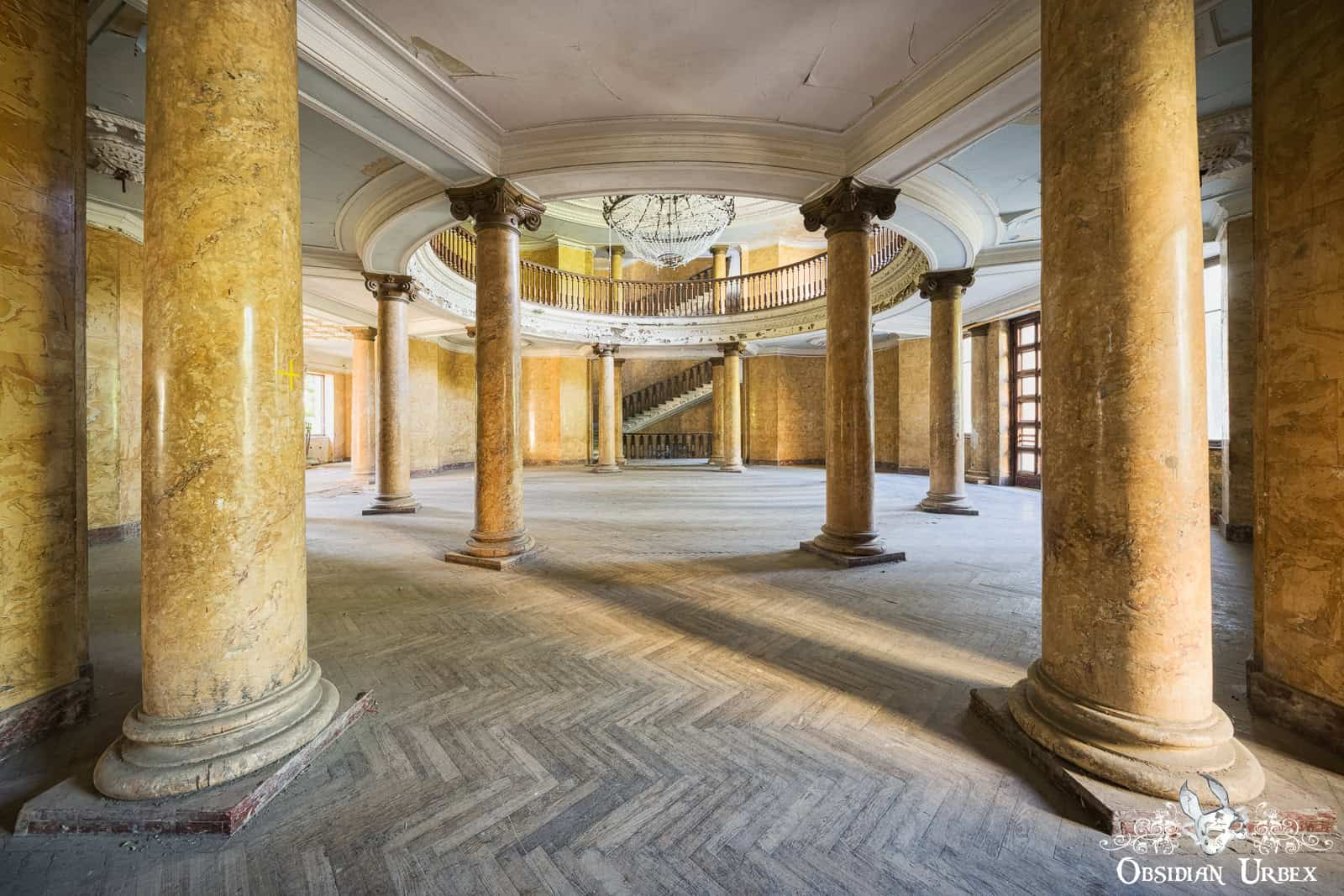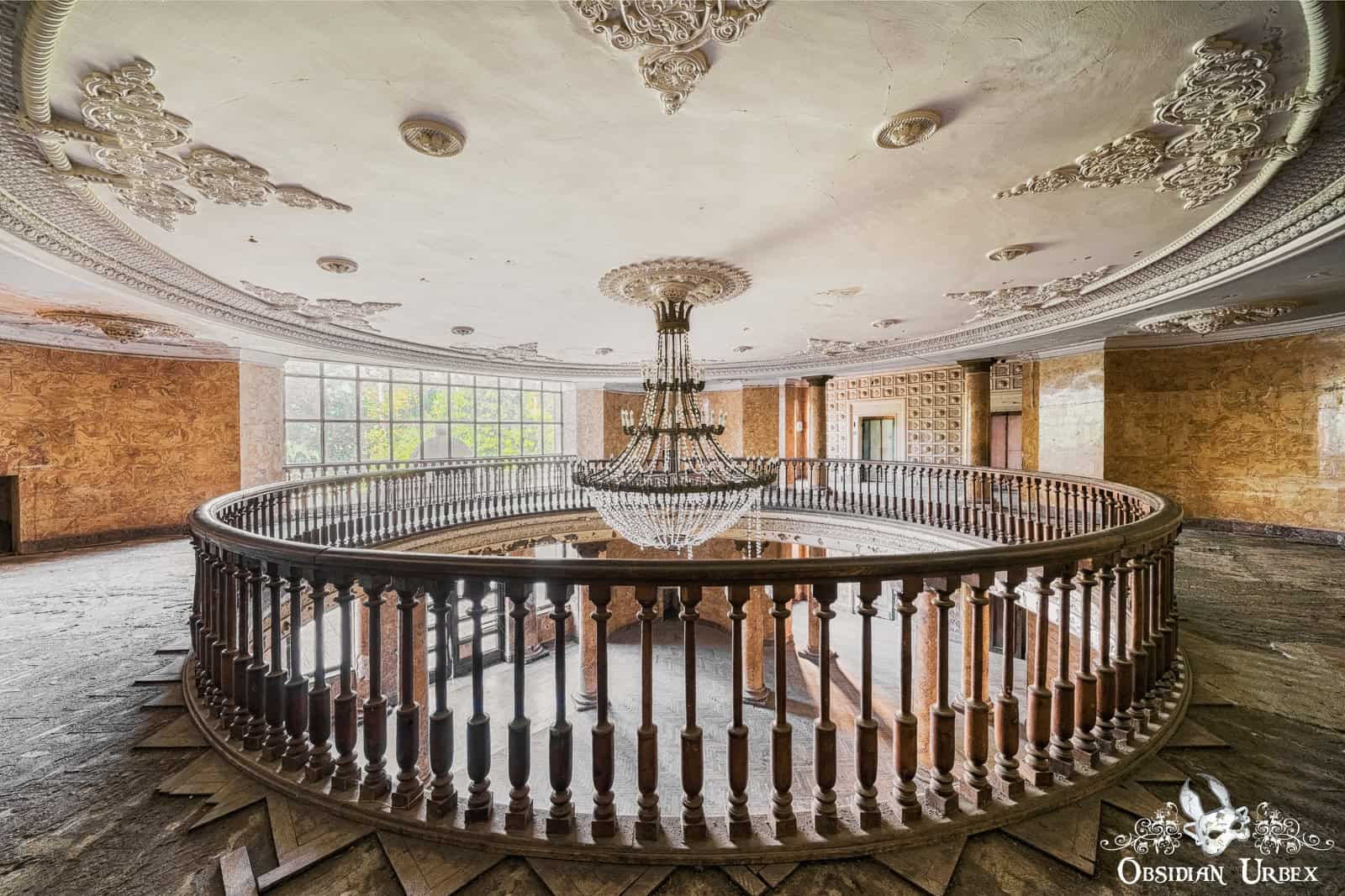 The first, and arguably most impressive, line area I explored was the entrance foyer. It was designed to make an immediate statement of “palatial” grandeur to the workers as they arrived for their vacation. The foyer spans two floors; the upper floor is a column-supported mezzanine overlooking the ground floor through a circular mezzanine opening. From the centre of the circular ceiling hangs a grand chandelier, one of the few original Soviet chandeliers that somehow escaped being looted after the fall of the USSR.