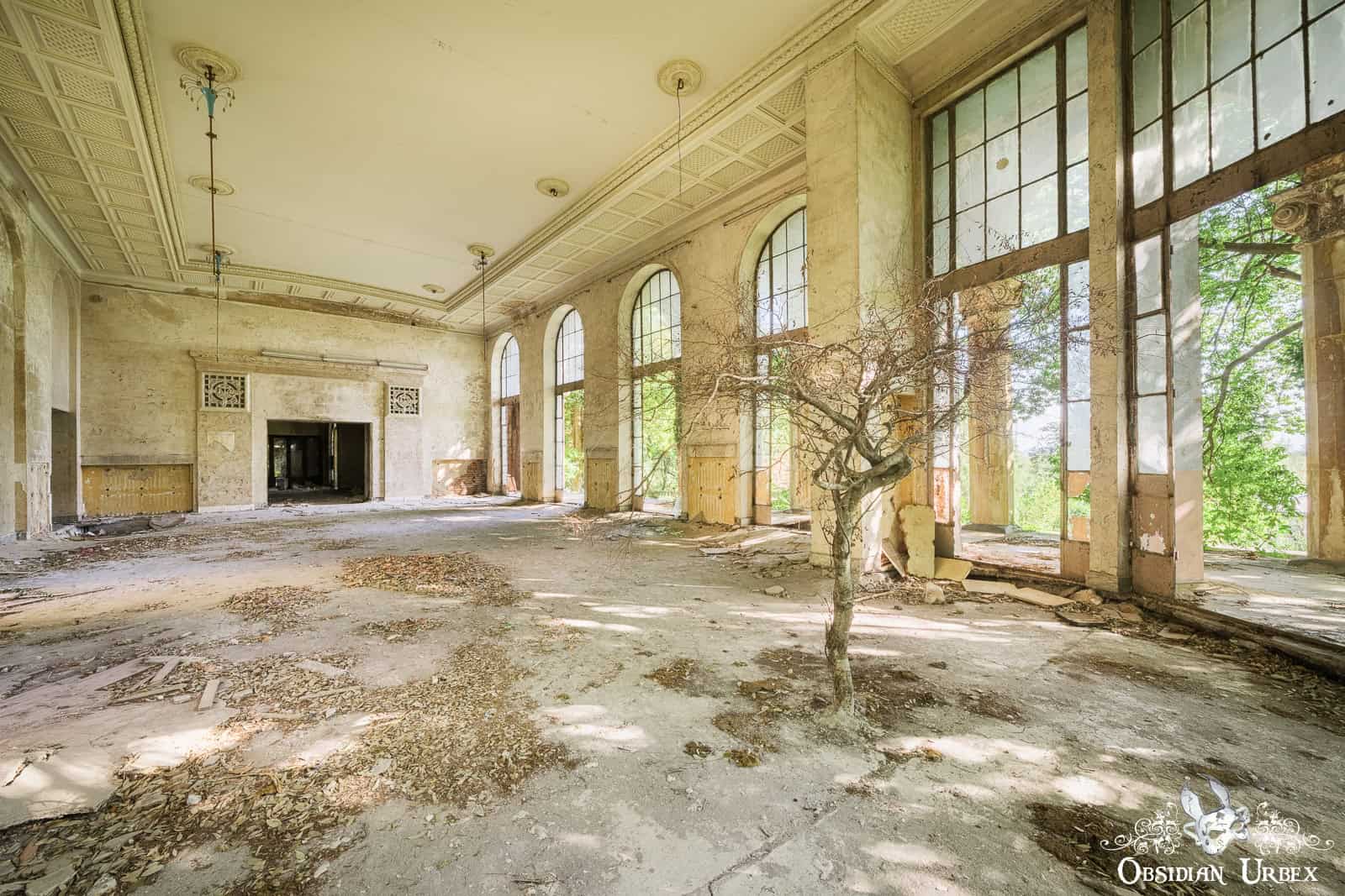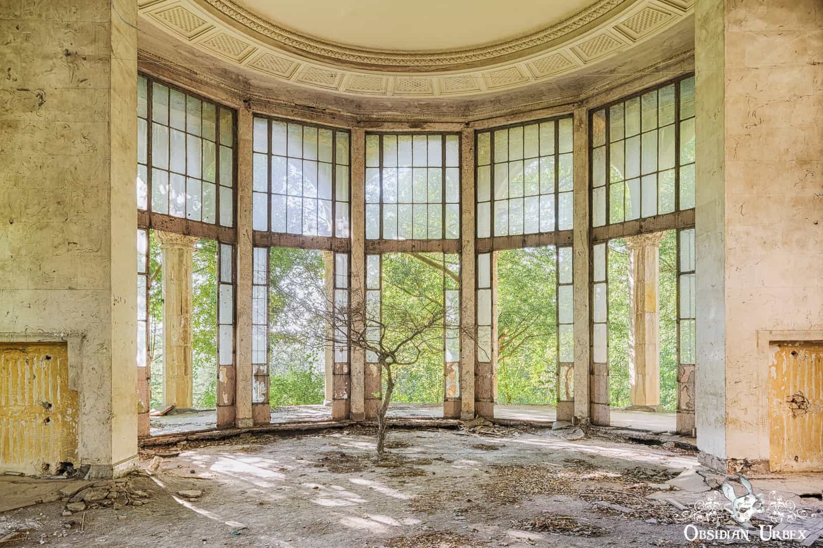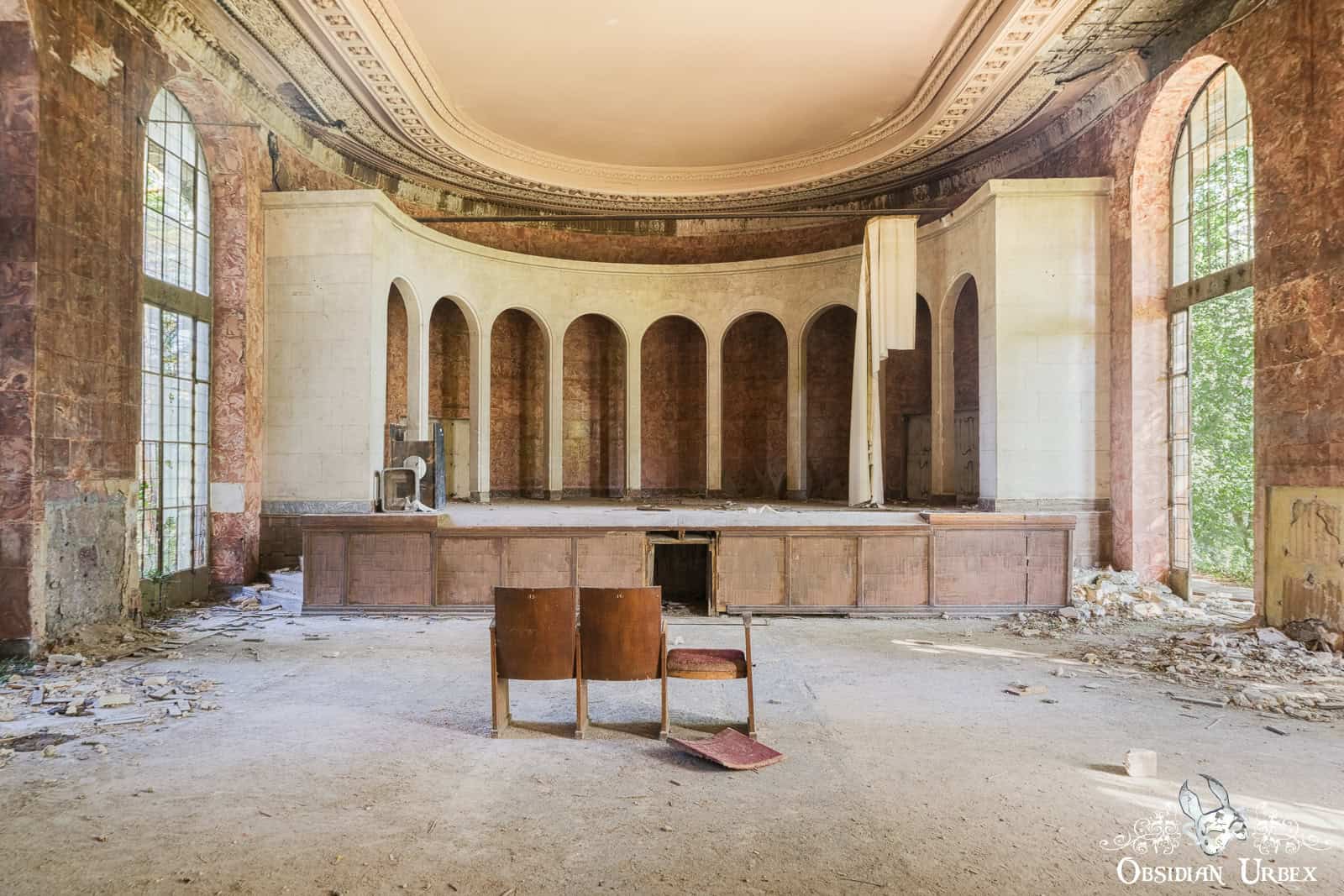 Branching off from the central foyer are two oval extensions. To the west is the theatre, or concert hall. Here workers would gather for nightly film screenings and theatre performances, all part of the “cultural health” programme filled with all the usual Soviet ideological messaging and propaganda. The east wing holds the grand dining hall, with floor-to-ceiling arched glass windows offering panoramic views of the (formerly) lush landscaped grounds. Nowadays, a lonely tree grows inside this space (just slightly off-centre!).