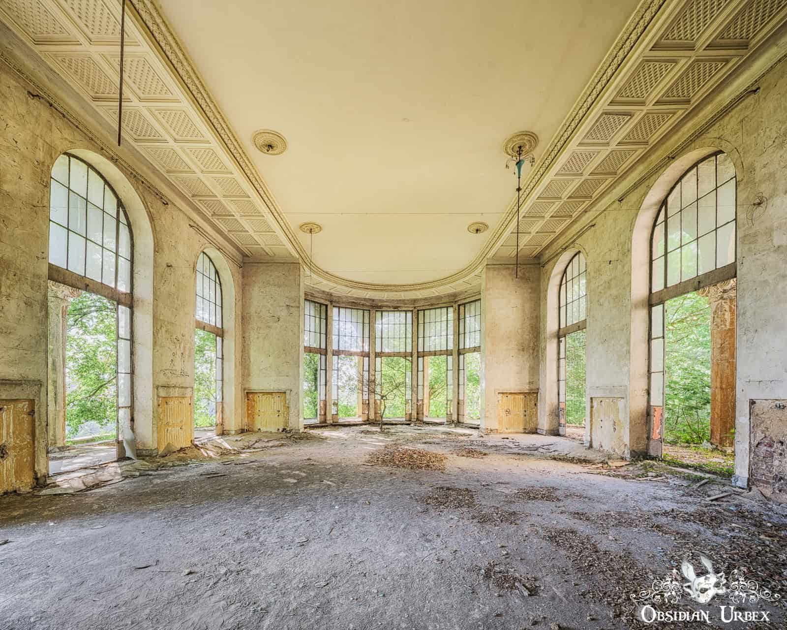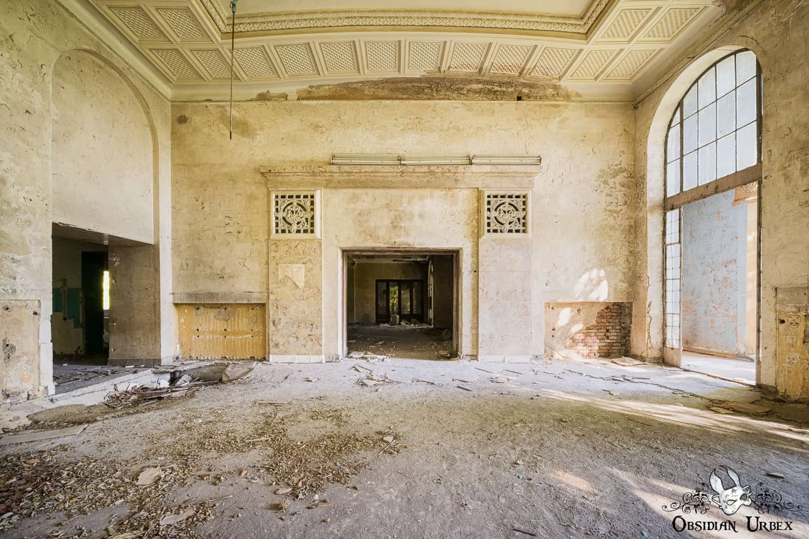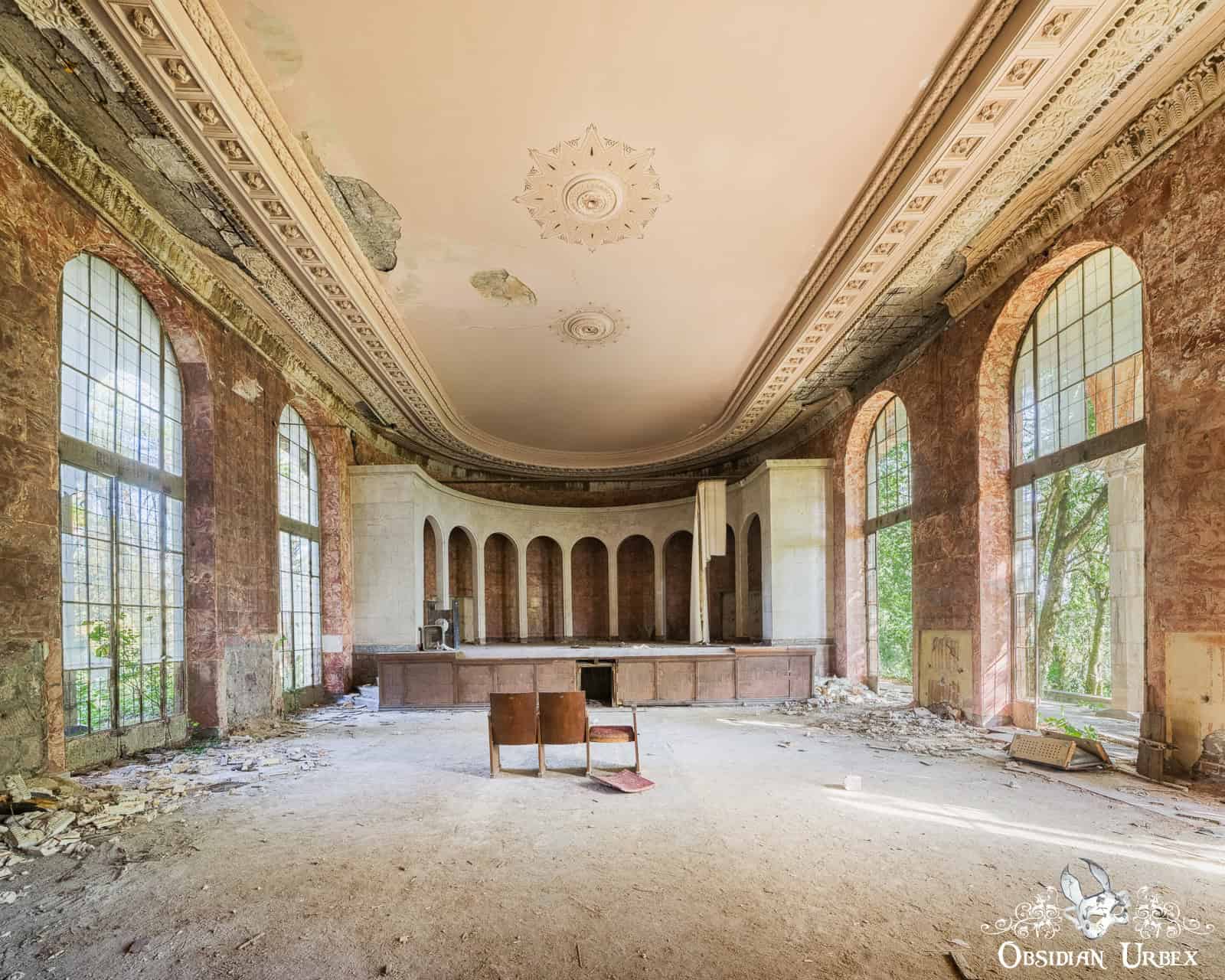 Branching off from the central foyer are two oval extensions. To the west is the theatre, or concert hall. Here workers would gather for nightly film screenings and theatre performances, all part of the “cultural health” programme filled with all the usual Soviet ideological messaging and propaganda. The east wing holds the grand dining hall, with floor-to-ceiling arched glass windows offering panoramic views of the (formerly) lush landscaped grounds. Nowadays, a lonely tree grows inside this space (just slightly off-centre!).
