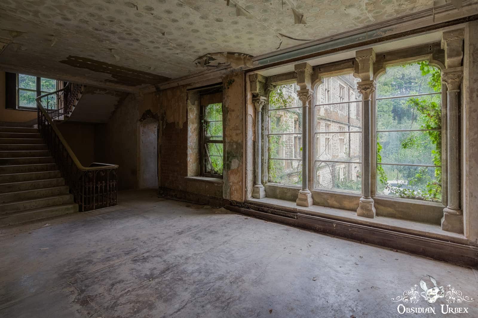 Several areas of the upper floors have collapsed after decades of neglect, succumbing to water ingress from the dilapidated roof. The empty limestone corridors feature various arches and decorative Corinthian-style columns. A ground floor room in the west-wing is circular in shape, and features a shallow domed ceiling.